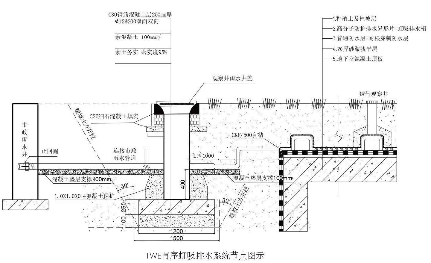 4、經(jīng)觀察井沉淀,排入有序虹吸排水系統(tǒng),待晴天需要對(duì)綠化植物進(jìn)行澆灌時(shí)再對(duì)雨水進(jìn)行循環(huán)利用,從以往的被動(dòng)排水轉(zhuǎn)變成了現(xiàn)在的主動(dòng)式排水,從而真正實(shí)現(xiàn)了零坡度、有組織排水。