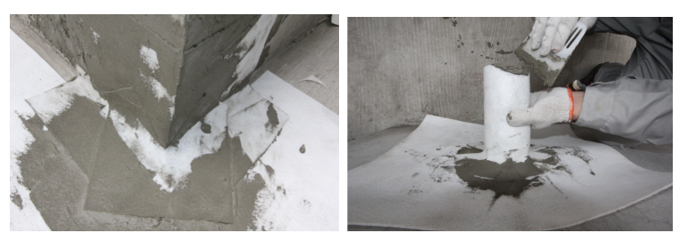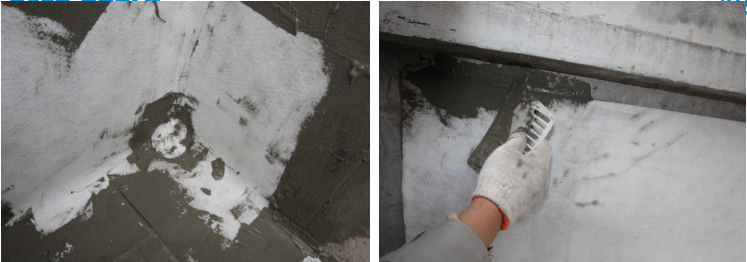 5、細(xì)部節(jié)點(diǎn)處理 1、陽角、陰角: 1.1將陽角、陰角部位浮漿、雜物鏟除,清理干凈后,若基面干燥時(shí)散水濕潤(rùn),掃除明水。 1.2陽角、陰角用水泥砂漿或防水砂漿抹成圓弧,圓弧半徑不小于50mm。 1.3裁剪一條寬500mm的卷材作為陽角或陰角附加防水層,然后涂刷水泥膠粘劑鋪設(shè)。 1.4陽角、陰角交接處附加層卷材在中心位置向一邊方向裁開,在方形卷材底部中間處劃一刀到卷材中心點(diǎn),使得卷材下沿叉開,然后涂刷水泥膠粘劑鋪設(shè)。 1.5再裁剪一塊(略成扇形)卷材,涂刷水泥膠粘劑后鋪設(shè)在開叉處的上面,將露出部位全部遮蓋。 2、管根部位: 2.1清理管根部位四周基面及管道壁,鐵管進(jìn)行除銹打磨,PVC管表面用鋼絲刷打磨粗糙,基面若基面干燥時(shí)散水濕潤(rùn),掃除明水。 2.2在管根部涂刷水泥膠粘劑,立面250mm高,平面超出洞口250mm寬。 2.3根據(jù)管道外徑剪一塊方形卷材,尺寸比管根半徑長(zhǎng)250mm,沿著卷材中心,劃開呈十字狀或米字狀的缺口,將劃開的卷材套入管道用滿粘法將卷材鋪設(shè)。 2.4根據(jù)管道外徑裁剪一條長(zhǎng)度大于管徑100mm,寬度不小于250mm的卷材,將其下端裁成鋸齒狀。將卷材套在管子的外面,然后用滿鋪法將卷材緊密粘貼在管道外壁,上下層接縫粘結(jié)時(shí)應(yīng)上下錯(cuò)開,平整嚴(yán)密,管道上端卷材用金屬箍或用鐵絲扎牢。