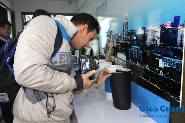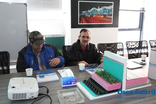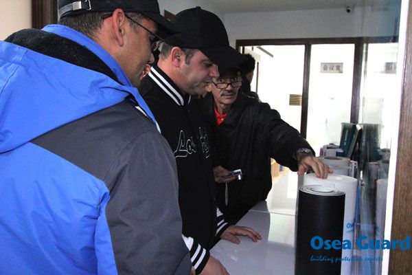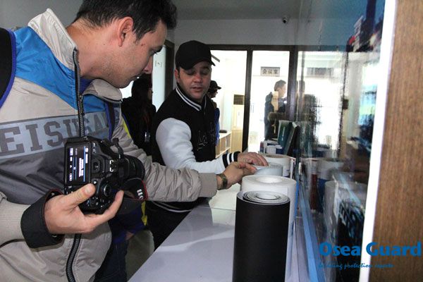上午八點,吳濤主任一行首先參觀考察了歐西建科現在施工工地——句容北部新城項目,在現場項目經理的帶領下,留學生深入了解了項目現場防水材料施工方法和步驟,實地體驗了施工工具使用。