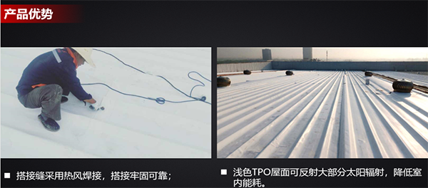 無穿孔機械固定系統——風荷載均勻分布在屋面上 傳統機械固定系統——風荷載相對集中在卷材邊緣 二、TPO的優秀性能決定了它的用途 2.1材料優勢—耐老化性 乙丙橡膠的超長耐老化性能,在室外暴露,紫外線強烈照射的情況下有記錄可查的使用壽命達到25年以上。 2.2材料優勢—焊接接縫 包括細部節點在內的所有接縫全部采用熱風焊接,焊接是所有防水卷材Z為可靠的接縫方式,徹底解決接縫不牢的弊端。