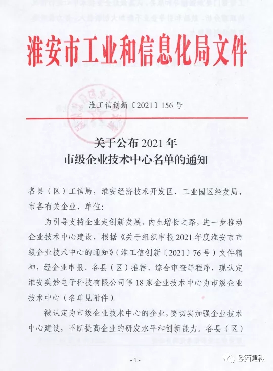 近日,淮安市工業(yè)與信息化局為我公司頒發(fā)了《淮安市市級(jí)企業(yè)技術(shù)中心》認(rèn)定。這是我公司繼獲得《國(guó)家高新技術(shù)企業(yè)》、《江蘇省科技型中小企業(yè)》、《江蘇省民營(yíng)科技型企業(yè)》等多項(xiàng)榮譽(yù)后,獲得的又一重要權(quán)威性認(rèn)證。