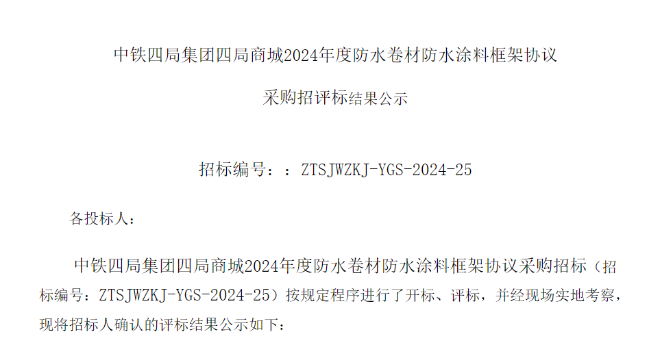 近日,中鐵四局集團四局商城2024年度防水卷材防水涂料框架協議采購招標,評標結果完成公示,其中,江蘇歐西建材科技發展有限公司成功入列。